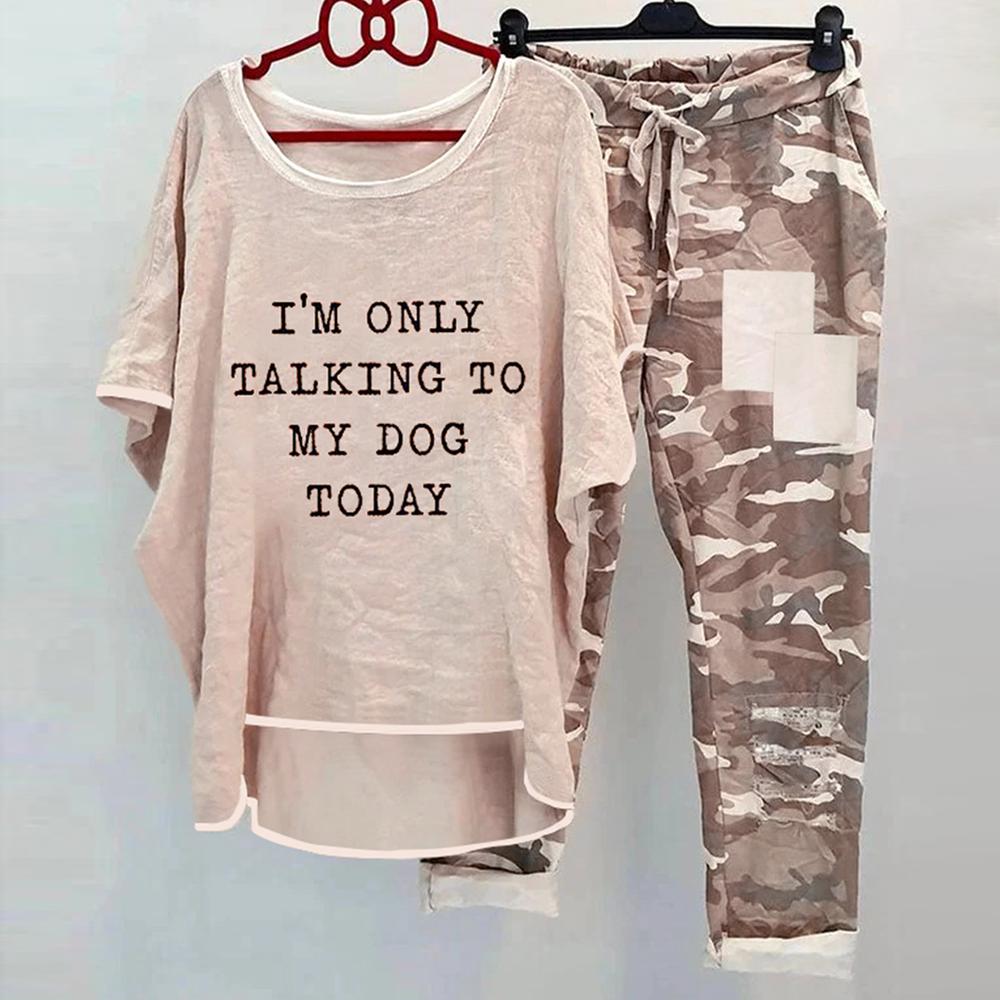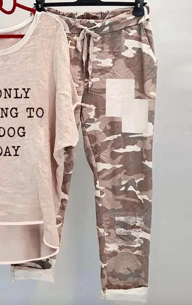 Cet ensemble deux pièces à col rond et imprimé kaki offre un look élégant et fonctionnel. Il comprend un haut et un bas imprimés, apportant une touche subtile de couleur et de texture. Parfait pour toutes les occasions décontractées, cet ensemble facile à porter fera sensation.