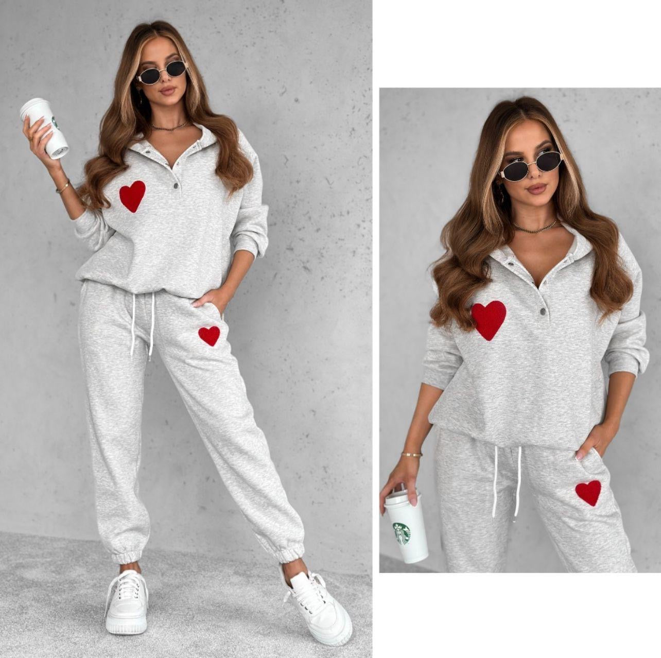 Le survêtement Elaine est composé de deux pièces : un pantalon taille haute avec élastique, poches latérales et petit cœur, ainsi qu'un haut orné d'un cœur !