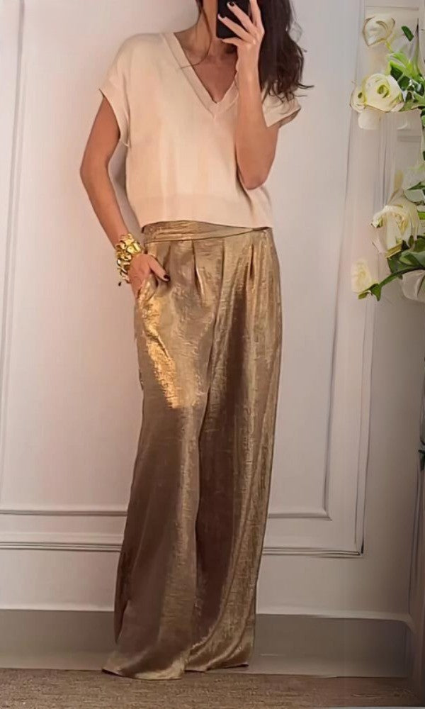 - Design : Look métallique intemporel, jambes larges, coupe ample