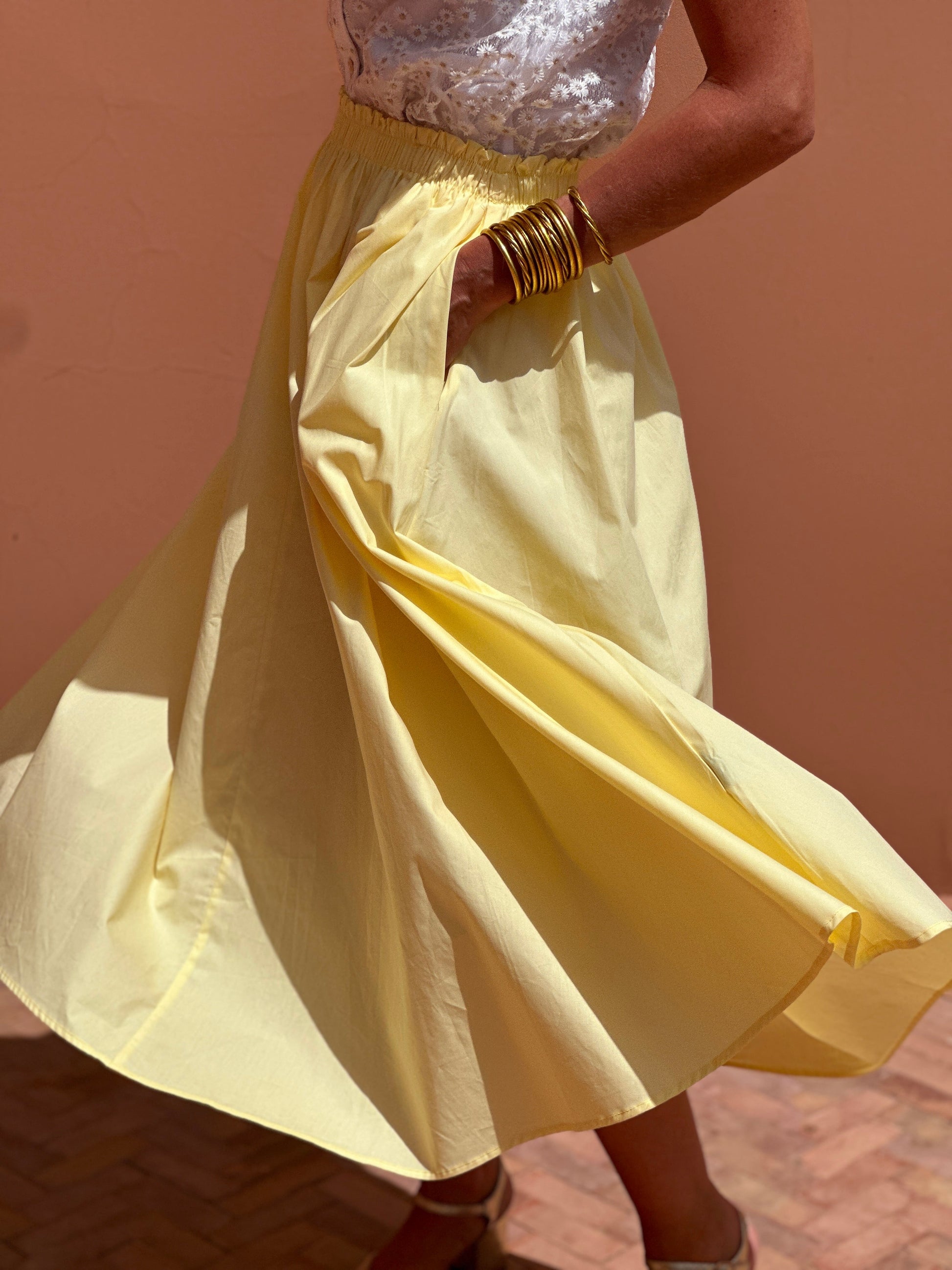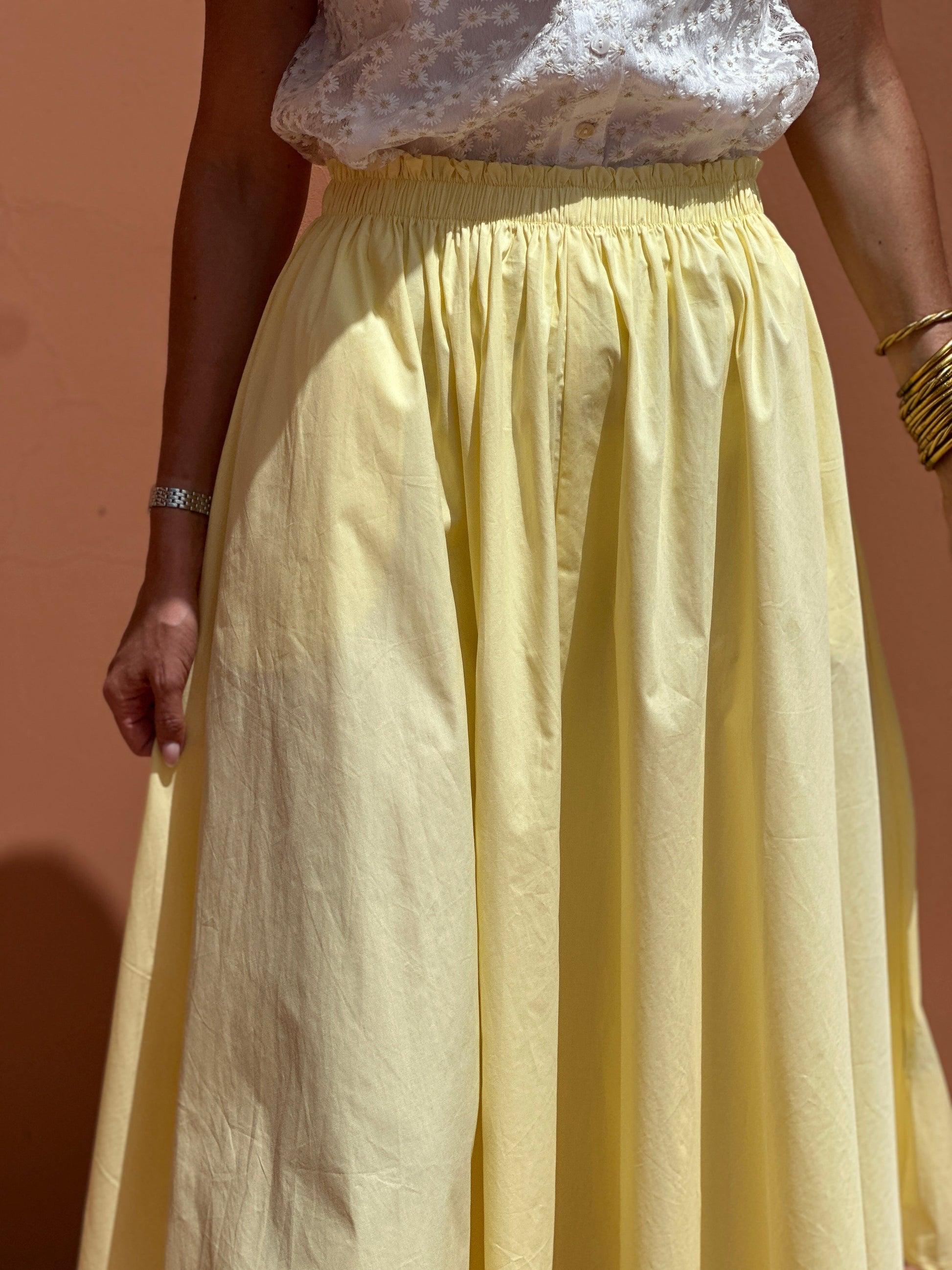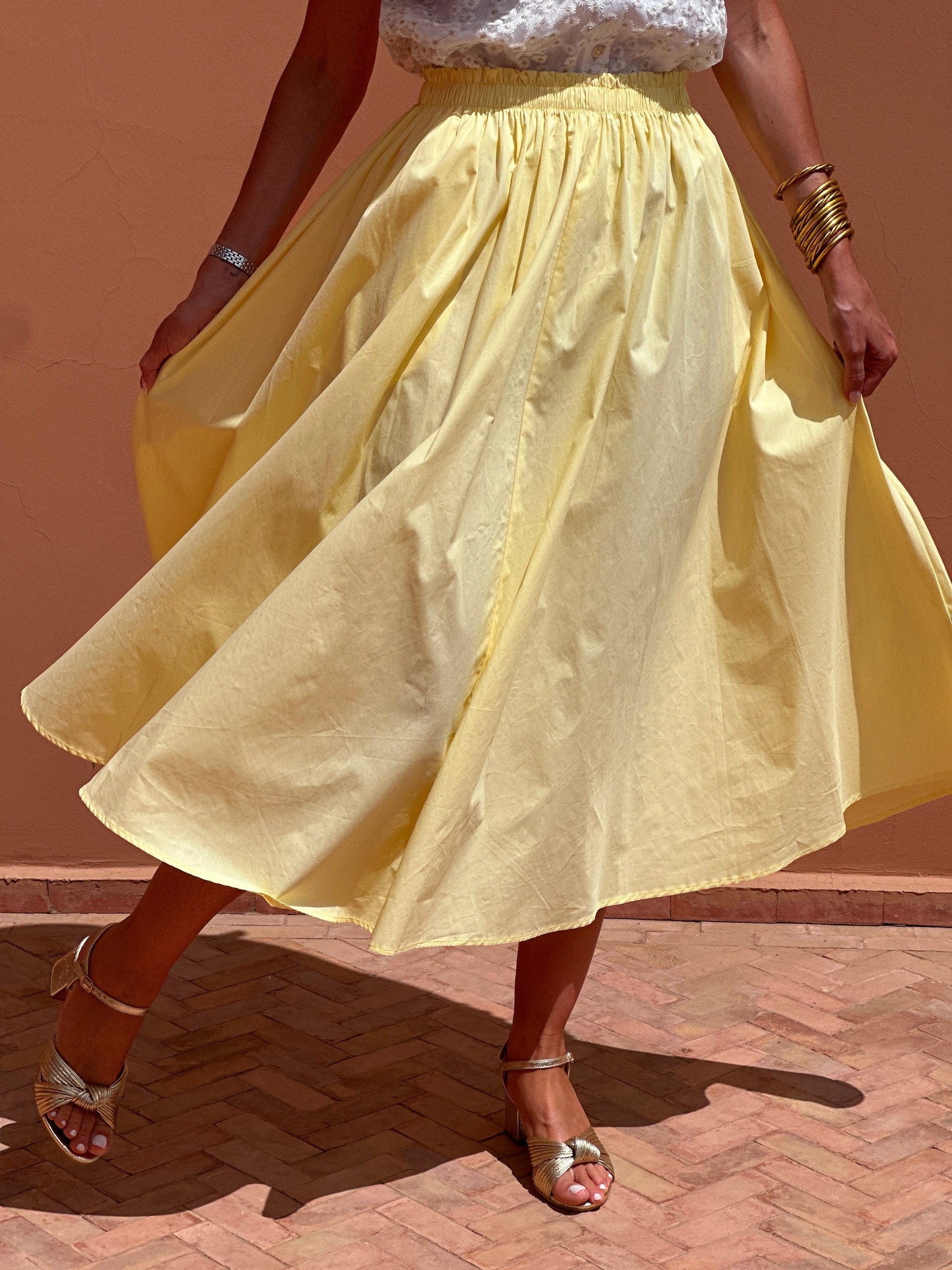 À la fois casual et ultra féminine, cette jupe longue revisite un essentiel du vestiaire avec une coupe évasée qui sublime toutes les silhouettes. Son tissu en 100% coton lui assure un tombé parfait, tandis que ses poches à l’italienne ajoutent une touche pratique et décontractée.