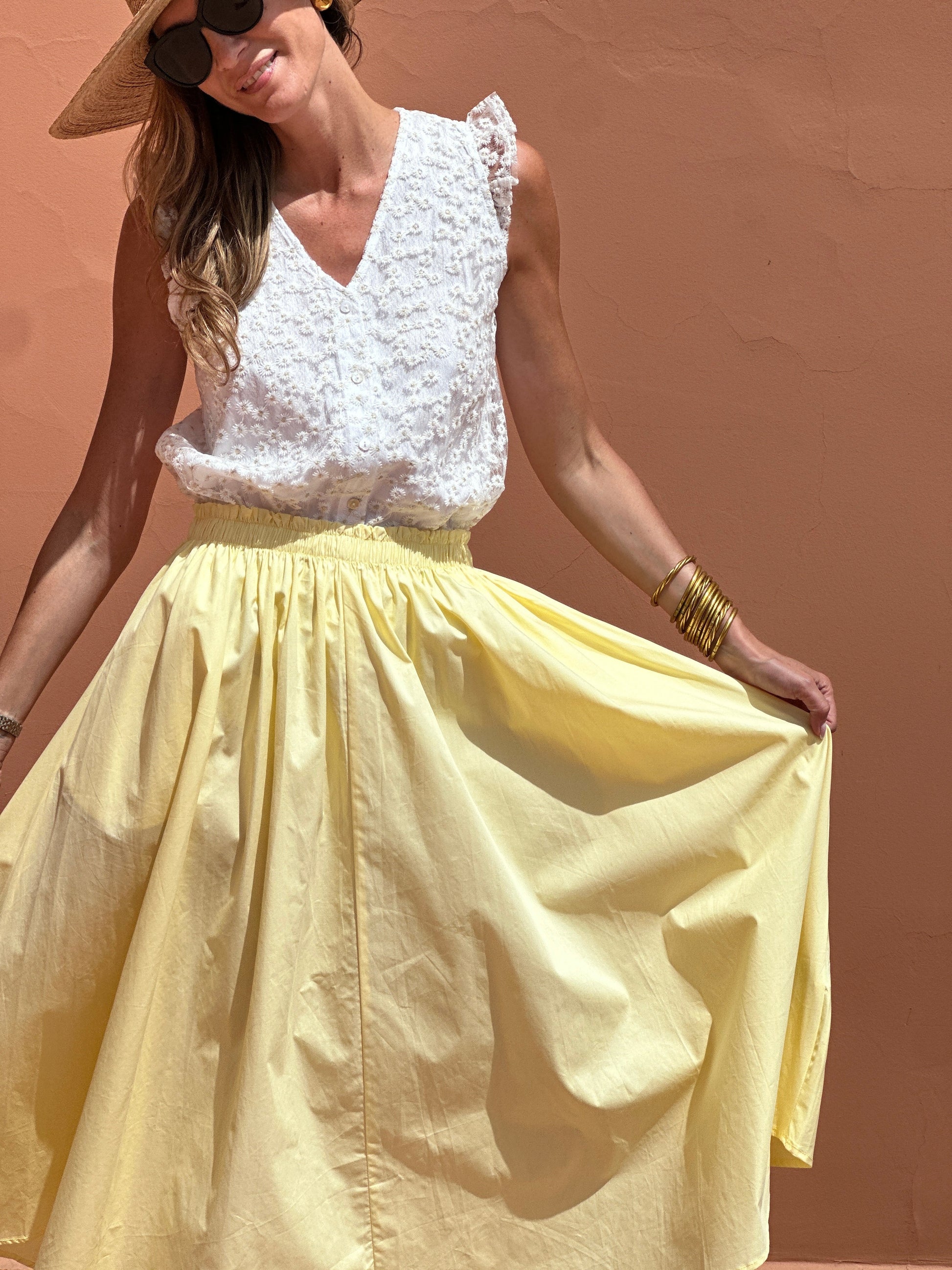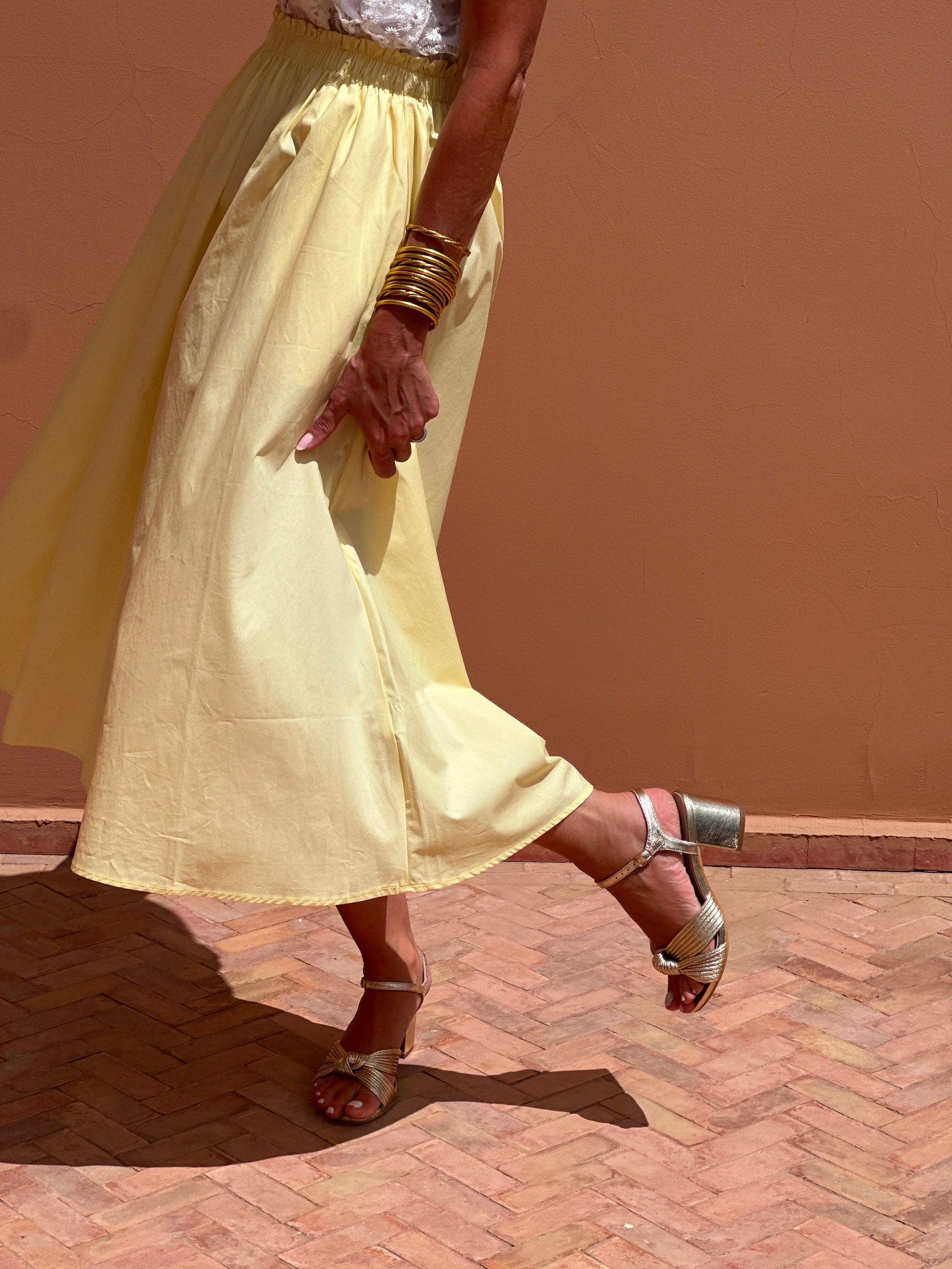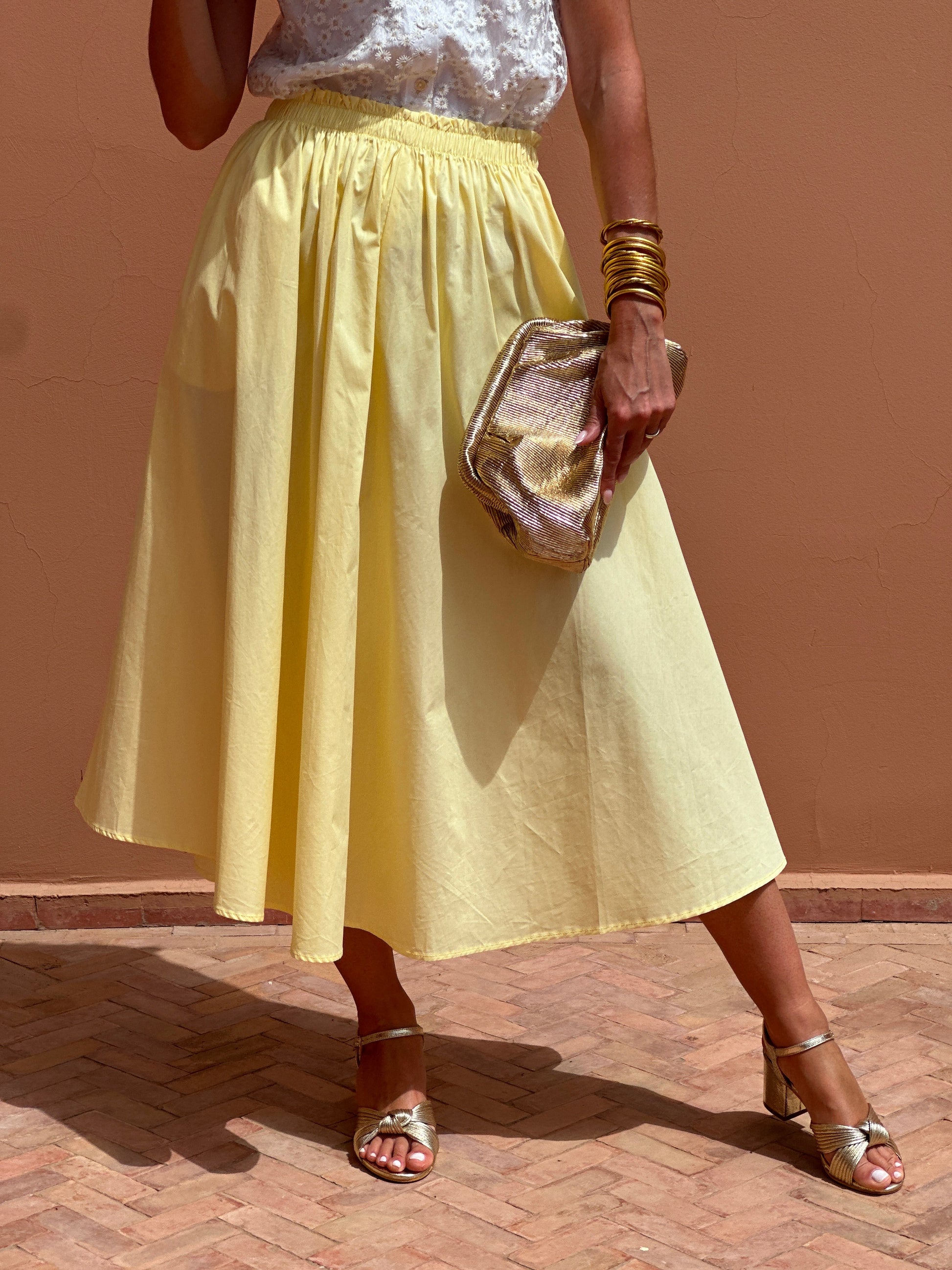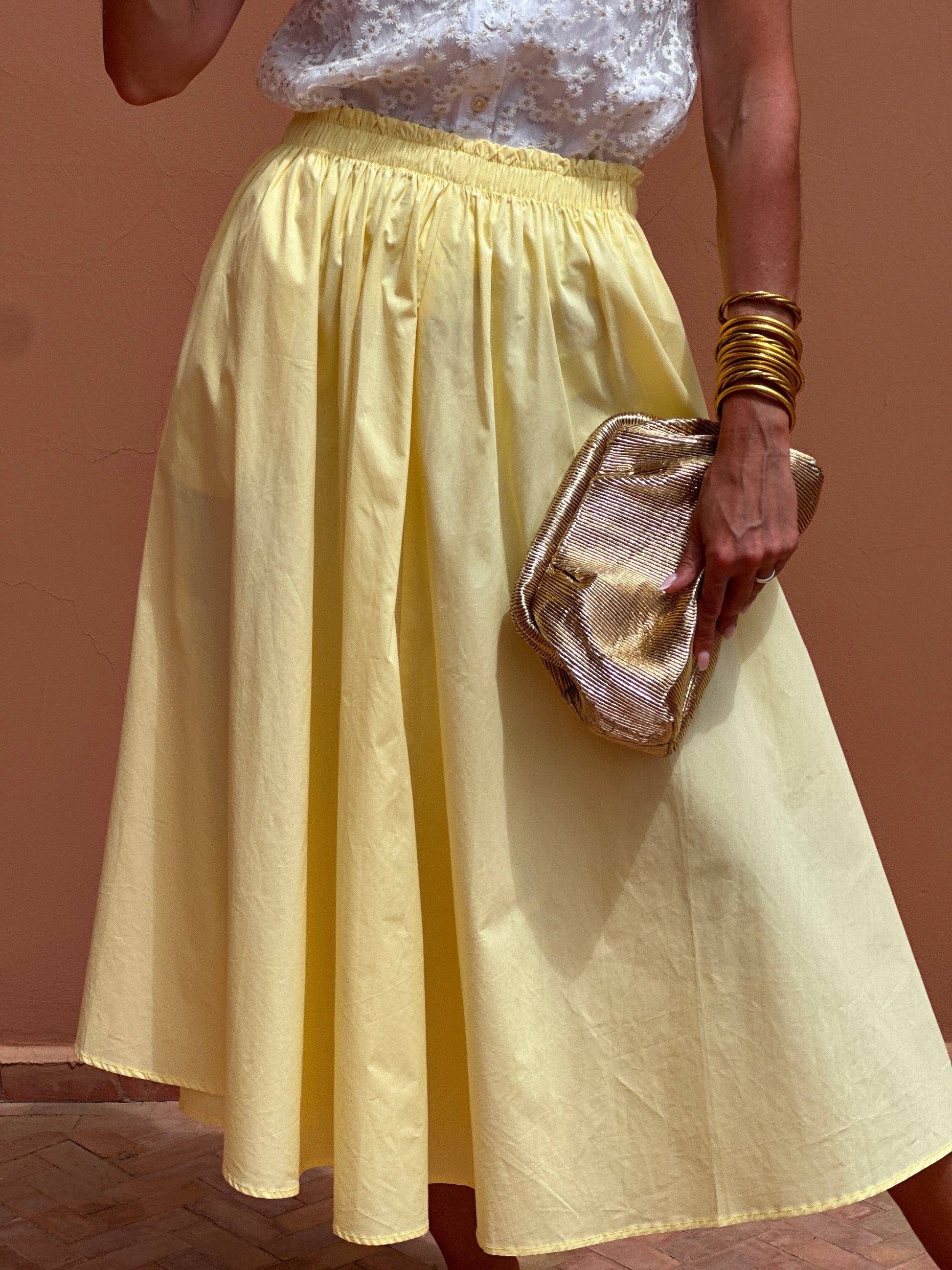 À la fois casual et ultra féminine, cette jupe longue revisite un essentiel du vestiaire avec une coupe évasée qui sublime toutes les silhouettes. Son tissu en 100% coton lui assure un tombé parfait, tandis que ses poches à l’italienne ajoutent une touche pratique et décontractée.