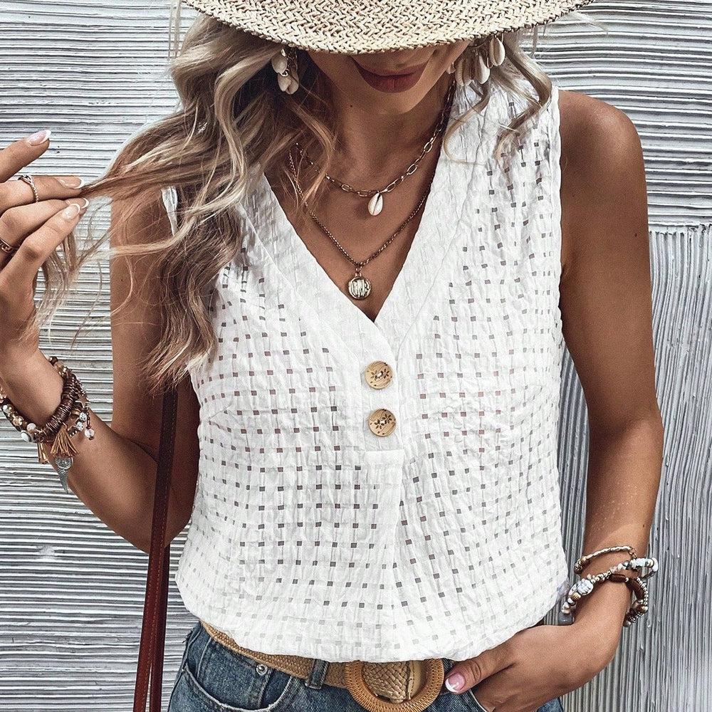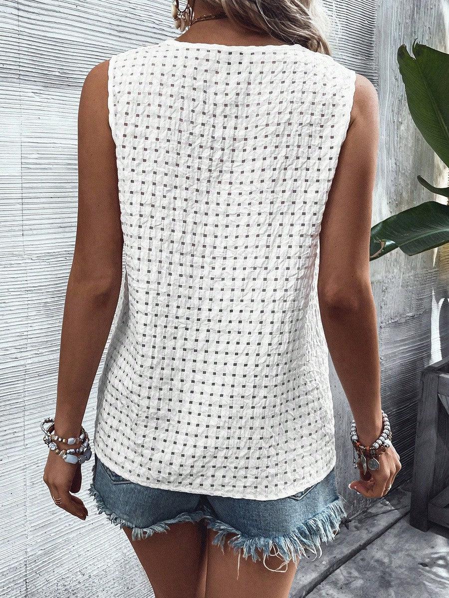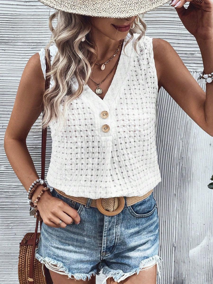 Ce débardeur blanc uni sans manches est confectionné dans une matière légère et respirante, idéale pour toutes les occasions, décontractées comme formelles. Son col en V et sa coupe ajourée ajoutent une touche d'élégance, tandis que le haut sans manches boutonné sur le devant offre un look classique et intemporel.